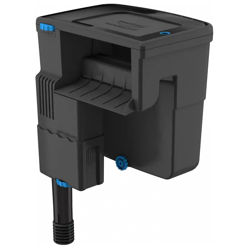 Les fentes d'aération dans le couvercle du filtre et les rainures d'aération dans le flux sortant garantissent que l'eau retournée dans le réservoir est entièrement oxygénée et maximisent l'échange de gaz pendant la filtration.